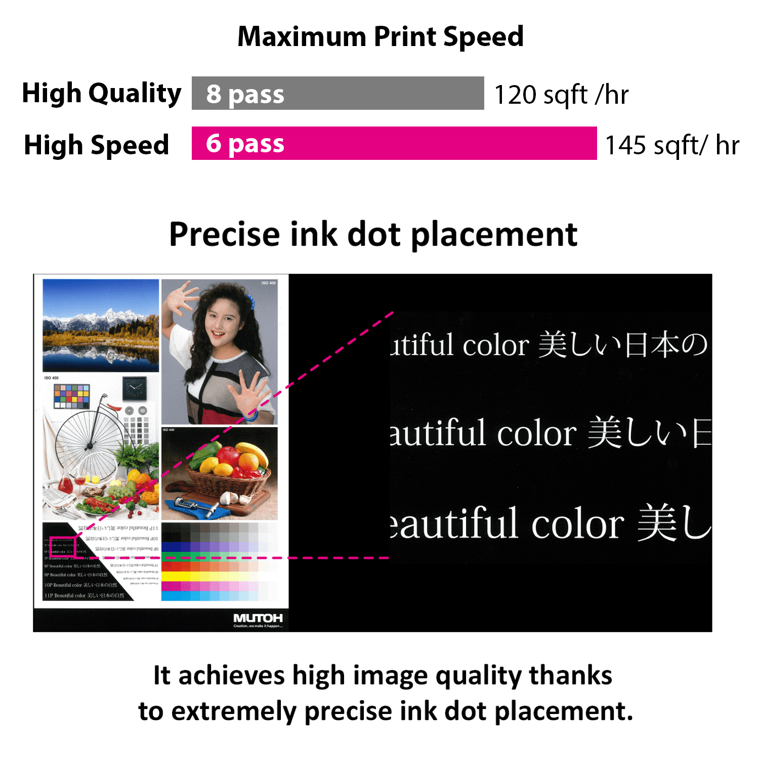 “AccuFine” is a new extra wide and high density piezo print head, and achieves both high image quality and high-speed printing by dramatically improving the landing accuracy. High quality solid printing with less banding even at high speed