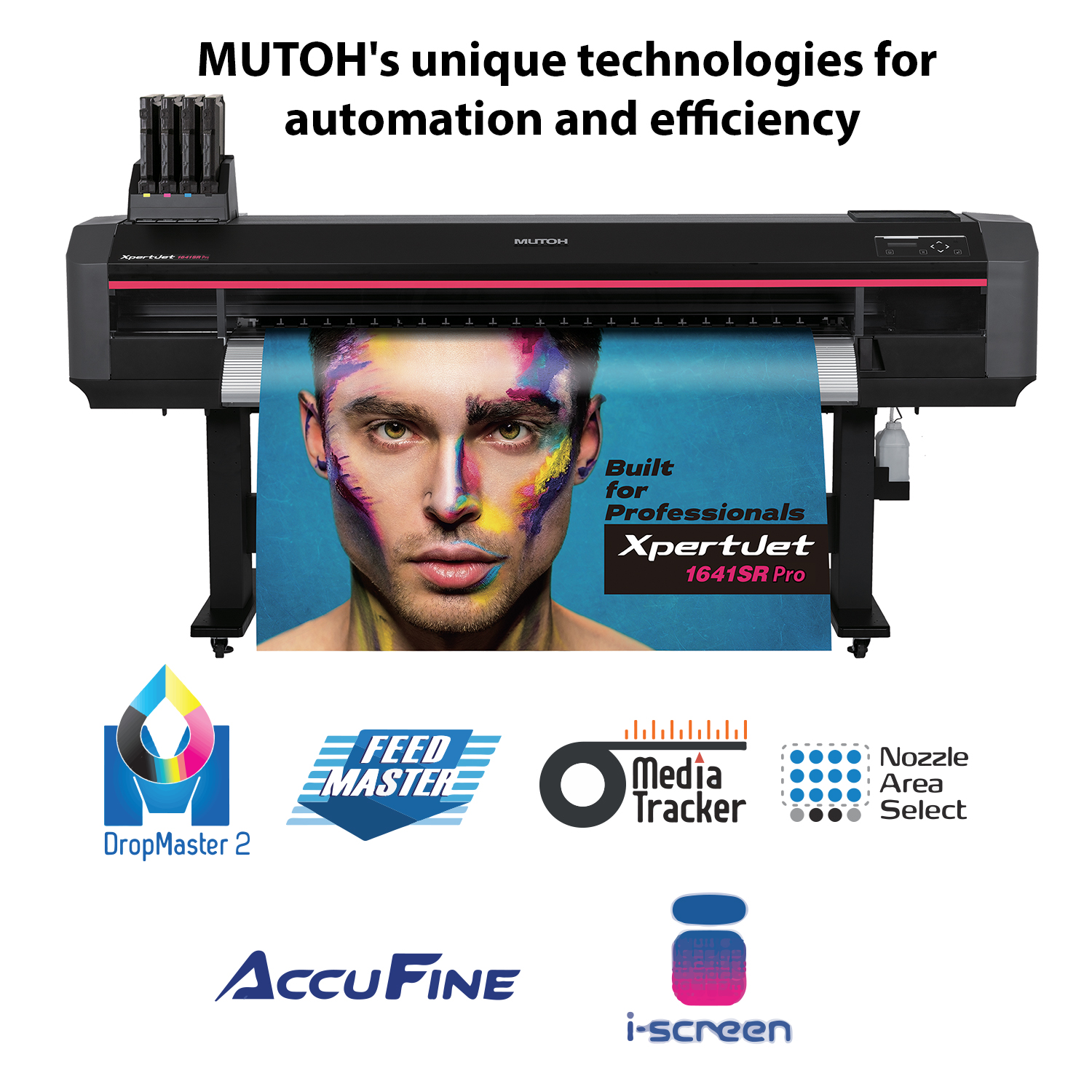 The best-balanced model for high image quality and high productivity.The MUTOH XpertJet series delivers outstanding print quality and high productivity. The XpertJet 1641SR Pro inherits a platform designed to improve operability and reduce operational workload. It is an uncompromising standard model that balances high image quality and high productivity by adopting a new print head.
