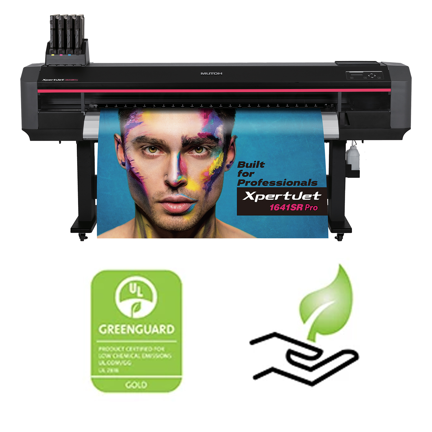 The MS41 eco-solvent ink paired with the printer excels in color development, weather resistance, and ease of maintenance. The ink has been certified UL GREENGUARD Gold, making it environmentally and also operator friendly.