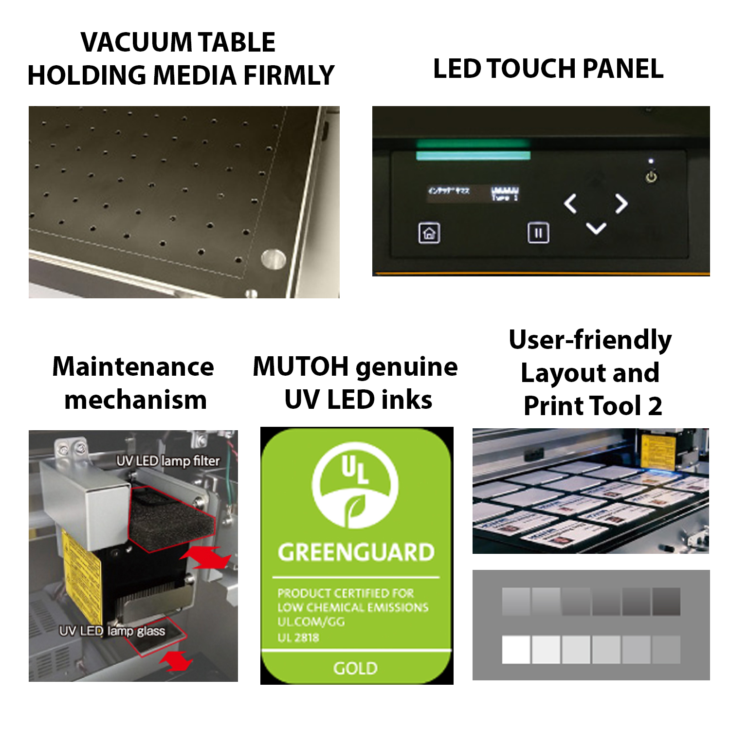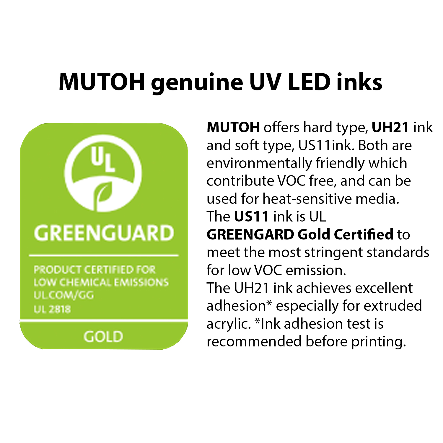 MUTOH offers hard type, UH21 ink and soft type, US11ink. Both are environmentally friendly which contribute VOC free, and can be used for heat-sensitive media. The US11 ink is UL GREENGARD Gold Certified to meet the most stringent standards for low VOC emission. The UH21 ink achieves excellent adhesion* especially for extruded acrylic. *Ink adhesion test is recommended before printing.