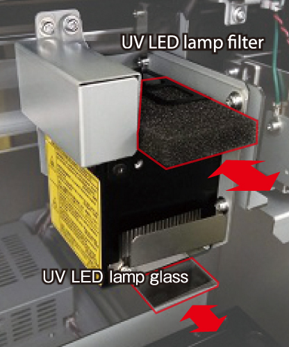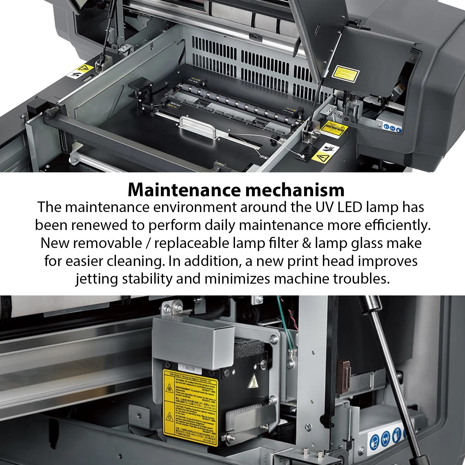 New removable / replaceable lamp filter & lamp glass make for easier cleaning. In addition, a new print head improves jetting stability and minimizes machine troubles.