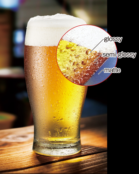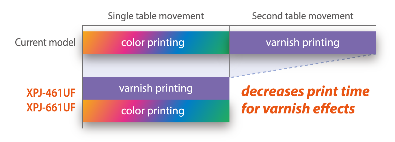 By dividing the irradiation area of the UV lamp, the varnish ink can be adjusted individually for greater segmented printing control. Glossy, semi-glossy and matte varnish effects can be produced in one table movement for prints combining CMYK + varnish or white + varnish.